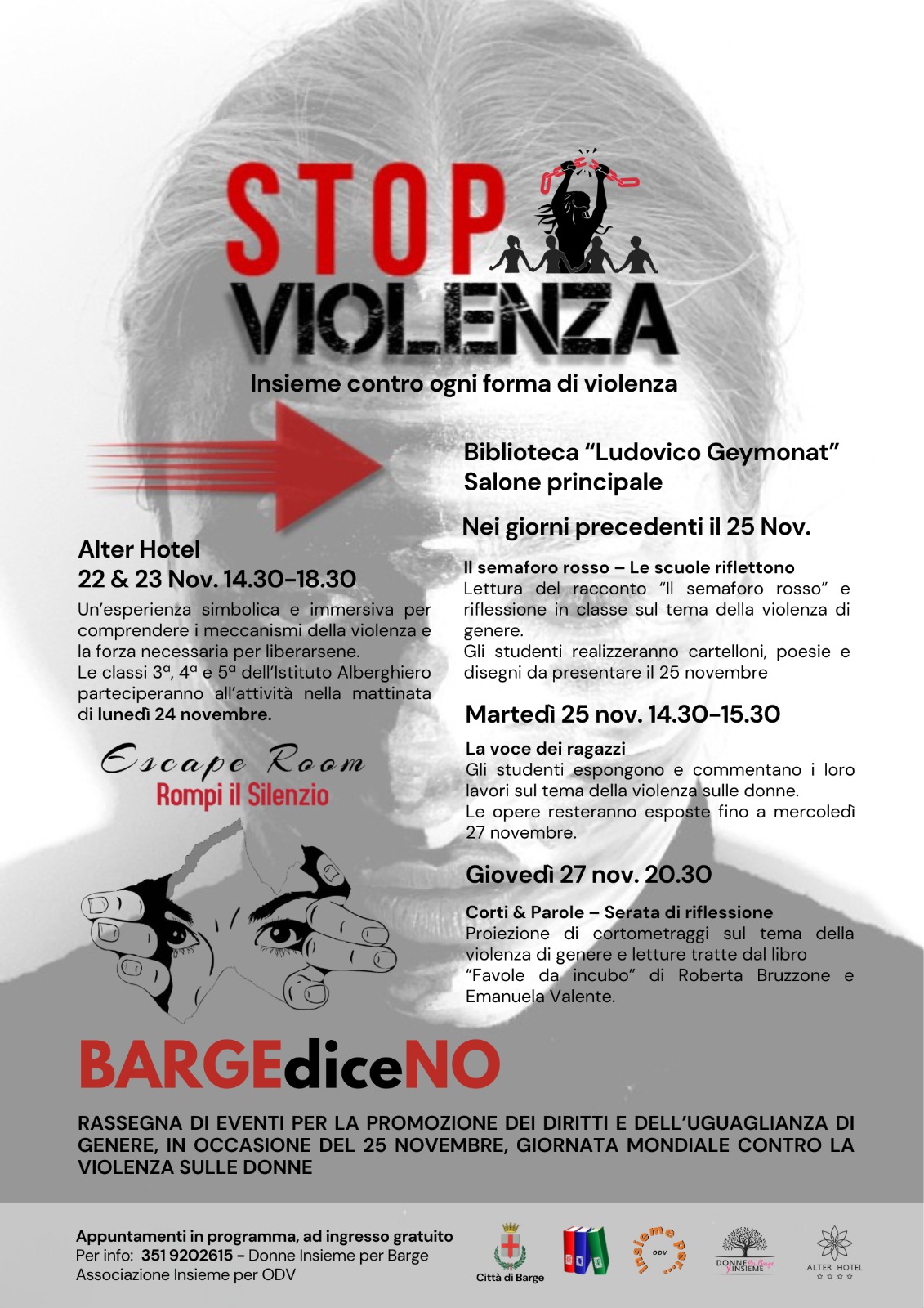 Ø      22 e 23 novembre, dalle ore 14,30 alle ore 18,30, presso l’Alter Hotel di Barge: “Escape room. Rompi il silenzio”, esperienza simbolica e immersiva per comprendere i meccanismi della violenza e la forza necessaria per liberarsene;